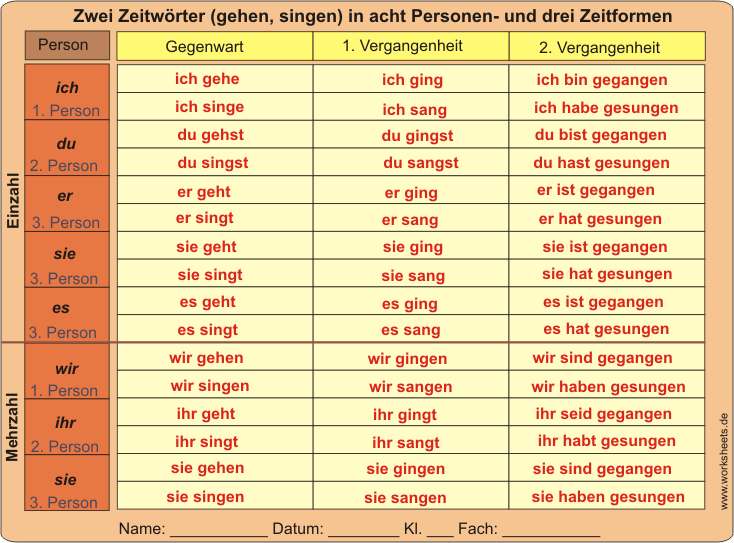 Zwei Zeitwörter (gehen, singen) in acht Personen- und drei Zeitformen