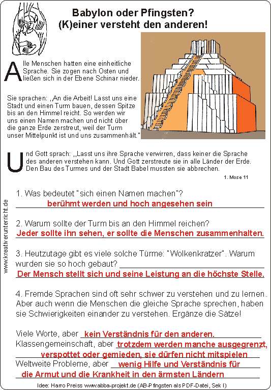 Babylon oder Pfingsten? (K)einer versteht den anderen! Arbeitsblatt und Lösungsfolie