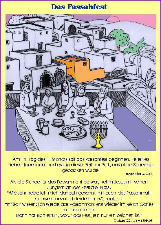 Das Passahfest wird von den Juden (=Volk Israel) seit 3000 Jahren gefeiert. Gott hat sie beim Auszug aus Ägypten vor dem sicheren Tod bewahrt, wenn sie das Blut eines Lammes an das Türkreuz gestrichen haben. An diese Befreiung aus der Sklaverei denken sie bis heute mit der Feier des Passahmahls.