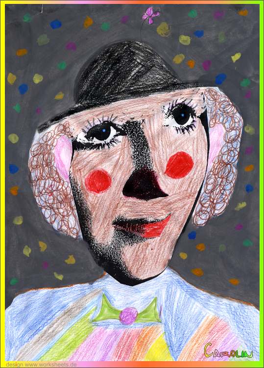 Der Kopf wurde für die Schüler auf ein DIN A3 Blatt kopiert. Sie mussten nun ihre eigene Vorstellung von einem Clown gestalten.