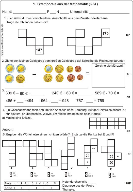 Erste Extemporale aus der Mathematik für die 3. Klasse