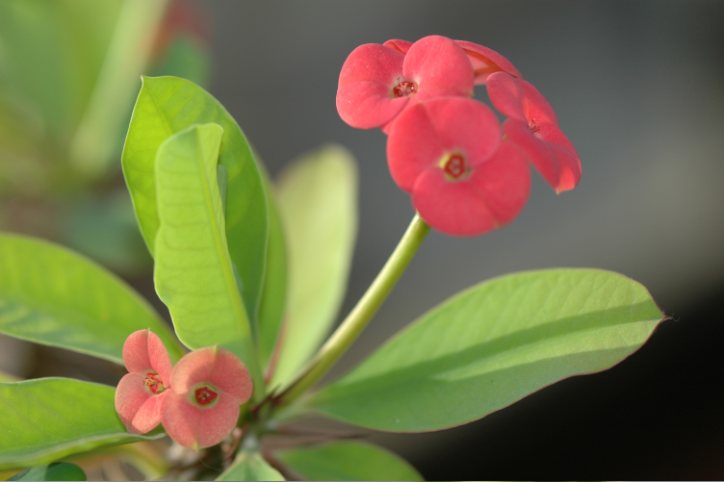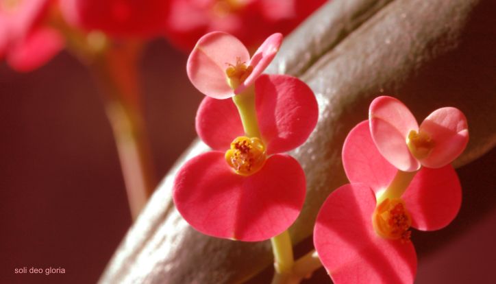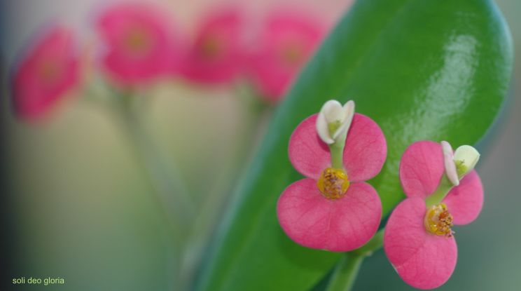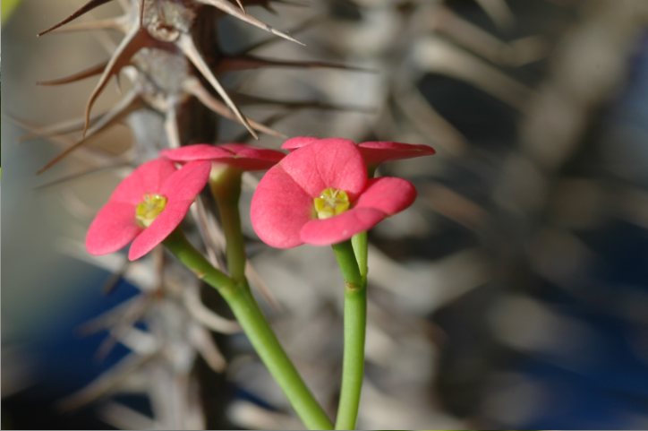 Mein Christusdorn blüht das ganze Jahr über und hat seit Jahren noch nie aufgehört zu blühen. Manchmal wächst aus einer Blüte eine zweite Blüte über der ersten Blüte. Siehe auch letztes Bild. Da beginnt sich eine zweite Blüte zu entwickeln.