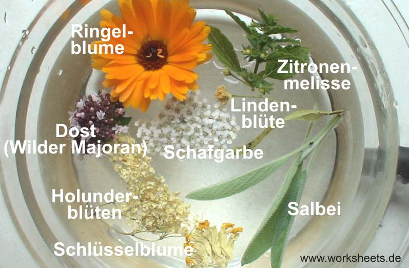 2. Den gesammelten Tee (z.B. Ringelblumen, Zitronenmelisse, Salbei usw. ) oben auf das heiße Wasser legen!