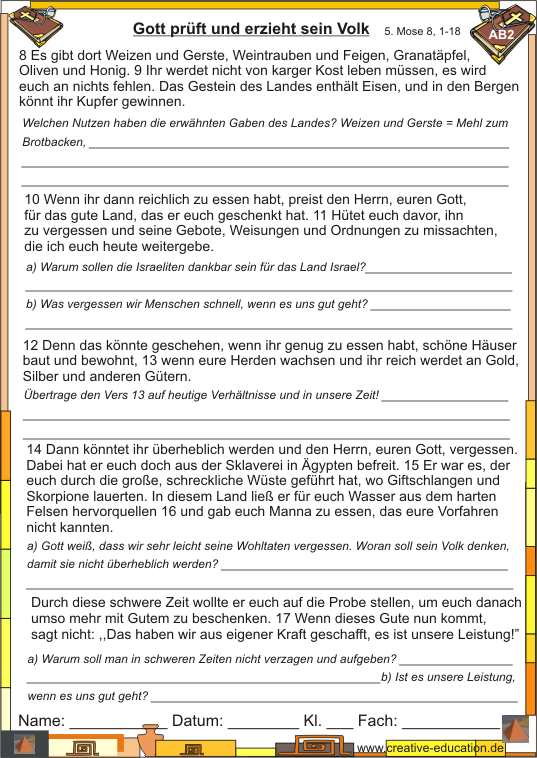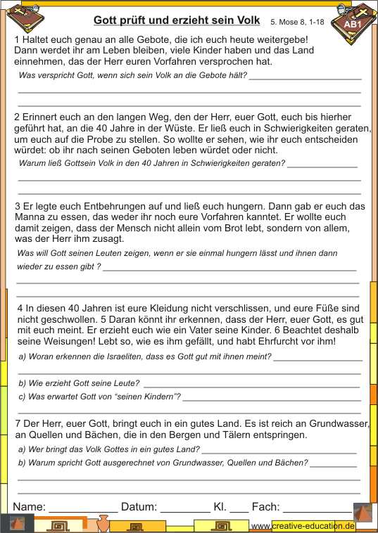 Gott prüft und erzieht sein Volk - Text aus: Fünftes Buch des Mose, Kapitel 8, Vers 1 bis 17, verteilt auf zwei Arbeitsblätter mit den dazugehörigen Fragen