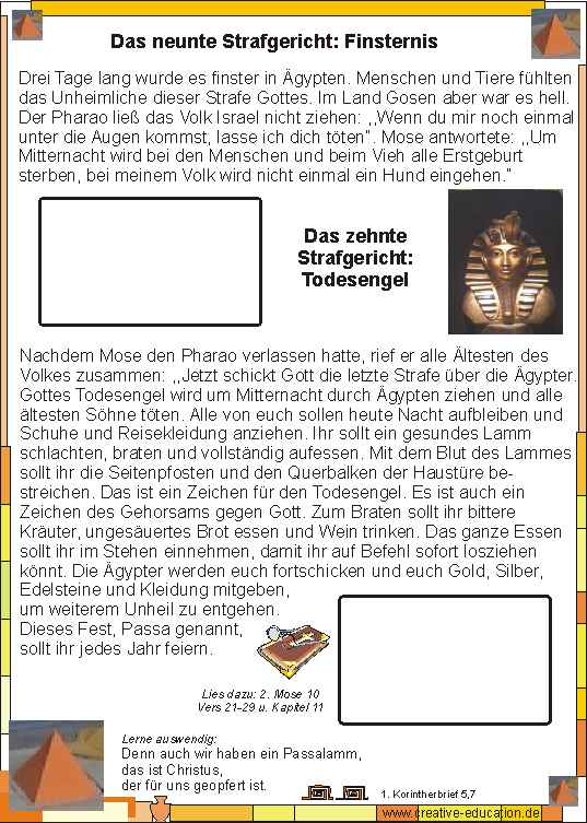Gottes Strafen 9 und 10 über Ägypten. Der Pharao lässt das Volk Israel nicht ziehen. - Arbeitsblatt und Lösungsfolie