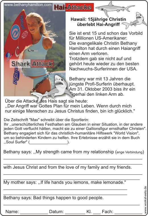 Hai-Attacke - Shark Attack Die 15jährige evangelikale Christin Bethany Hamilton , Nachwuchs-Surferin aus den USA, überlebt Hai-Angriff.
