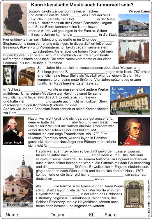 Material für die Gruppenarbeit: Haydns Lebenslauf wird auf 7 Gruppen verteilt. Jede Gruppe schreibt das wesentliche aus dem Text heraus und trägt es dann im Sitzkreis den anderen vor. Jede Gruppe ist dazu aufgerufen eine eigene Überschrift über ihren Textabschnitt zu finden.