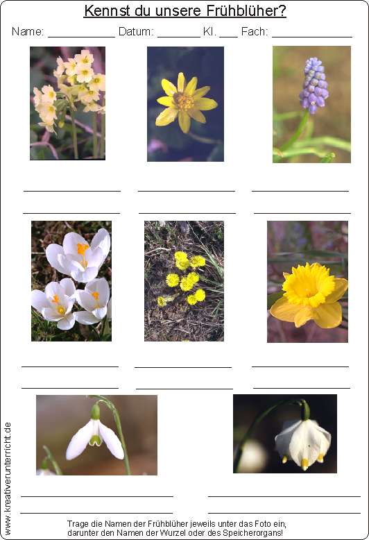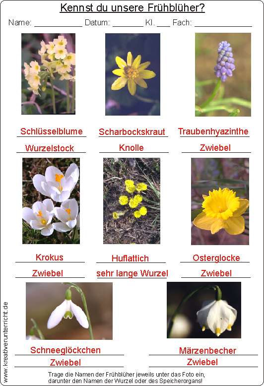 Schlüsselblume, Scharbockskraut, Traubenhyazinthe, Krokus, Huflattich, Osterglocke(Narzisse), Schneeglöckchen, Märzenbecher;