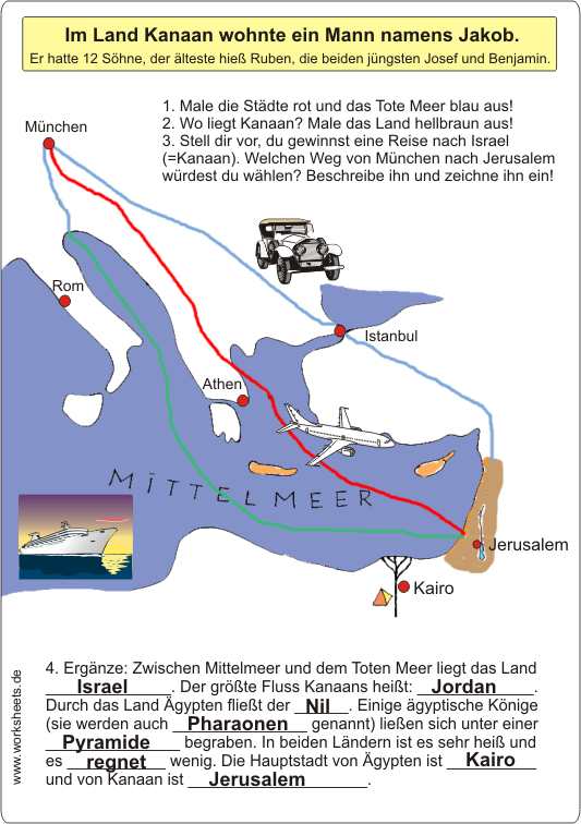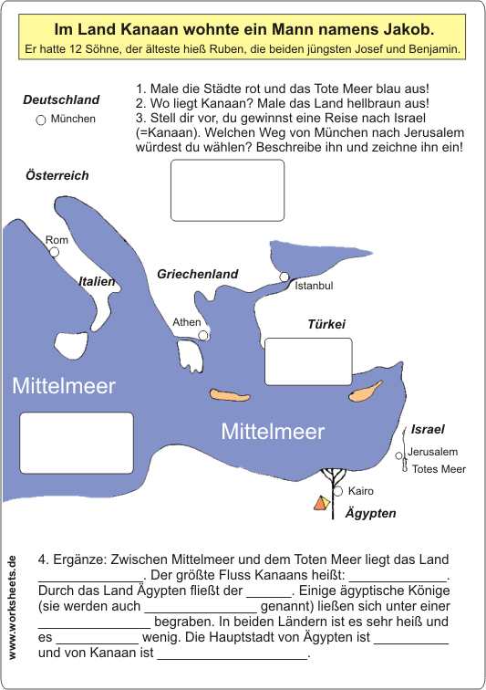 Landkarte: Im Land Kanaan (Israel) wohnte ein Mann namens Jakob. Er hatte 12 Söhne, der älteste hieß Ruben, die beiden jüngsten Josef und Benjamin.