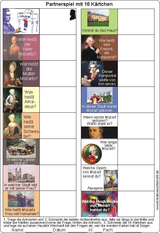 Zuerst gemeinsam die Fragen beantworten und in die Kästchen daneben schreiben. Dann die zwei Achterreihen jeweils in der Mitte längs falten und jeweils Vorder- und Rückseite zusammenkleben, so dass vorne das Bild ist und hinten die Antwort. Schließlich werden die 16 Kärtchen einzeln ausgeschnitten und auf einen Haufen gelegt. Zwei Partner nehmen immer ein Bild und stellen ihrem Nachbarn die Frage. Weiß er die Antwort, gehört das Kärtchen ihm. Wer die meisten Kärtchen zum Schluss hat, ist der Sieger.