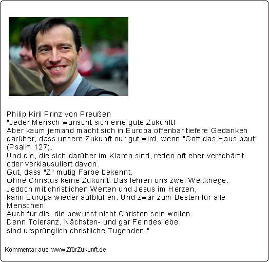 Philip Kiril Prinz von Preußen "Jeder Mensch wünscht sich eine gute Zukunft! Aber kaum jemand macht sich in Europa offenbar tiefere Gedanken darüber, dass unsere Zukunft nur gut wird, wenn "Gott das Haus baut" (Psalm 127). Und die, die sich darüber im Klaren sind, reden oft eher verschämt oder verklausuliert davon. Gut, dass "Z" mutig Farbe bekennt. Ohne Christus keine Zukunft. Das lehren uns zwei Weltkriege. Jedoch mit christlichen Werten und Jesus im Herzen, kann Europa wieder aufblühen. Und zwar zum Besten für alle Menschen. Auch für die, die bewusst nicht Christen sein wollen. Denn Toleranz, Nächsten- und gar Feindesliebe sind ursprünglich christliche Tugenden."