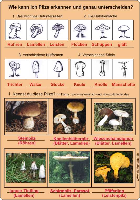 Verschiedene Pilze erkennen und genau unterscheiden nach Formen und Farben - Arbeitsblatt mit Lösungsfolie