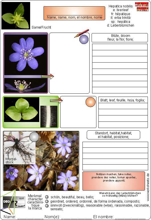 Steckbrief Leberblümchen, Hepatica nobilis, liverleaf, hépatique, erba trinità, (la flor hepática) Arbeitsblatt zur Differenzierung - Mit Videoclip, Büchern und Internet die Eigenschaften selbst entdecken