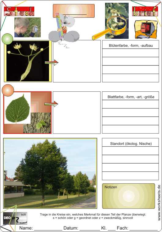 Steckbrief - Linde -Blatt, Blüte und Stamm mit der Lupe untersuchen, abzeichnen und beschreiben Arbeitsblatt