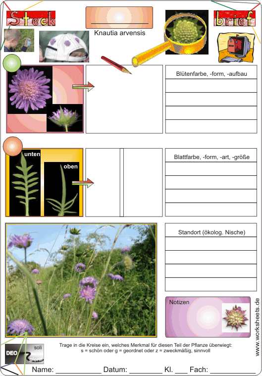 Steckbrief: Skabiose oder Acker-Wittwenblume - mit Blüte, Blatt und ökologischer Nische (sie wächst am Rand von Wegen und Feldern).