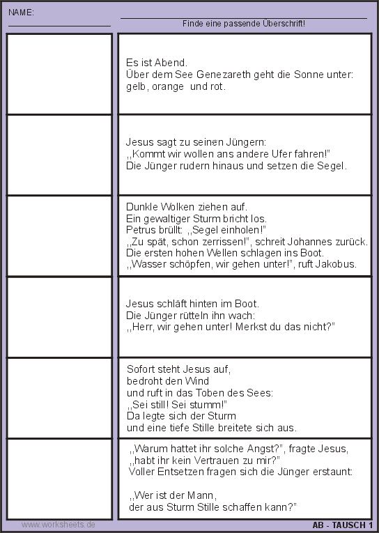 Durch Lehrerezählung, Bastelarbeit und Lied und eventuell szenisches Spiel wurde das Ereignis der Sturmstillung, das im Neuen Testament geschildert wird, eingeführt. Um das Geschehen bei der Stillung des Sturms auf dem See Genezareth zu vertiefen und längerfristig zu memorieren, habe ich die Tausch-Methode (Bild/Text) eingesetzt. Da es den Schülern leichter fällt, zu einem Text zu malen, sollte man mit “Tausch 1” beginnen, danach bei “Tausch 2” Texte zu den Bildern verfassen lassen. Die Texte sind für den Lehrer sehr aufschlussreich, sie zeigen unter anderem auch , wie weit der Schüler* bei seinem Verständnis gekommen ist.