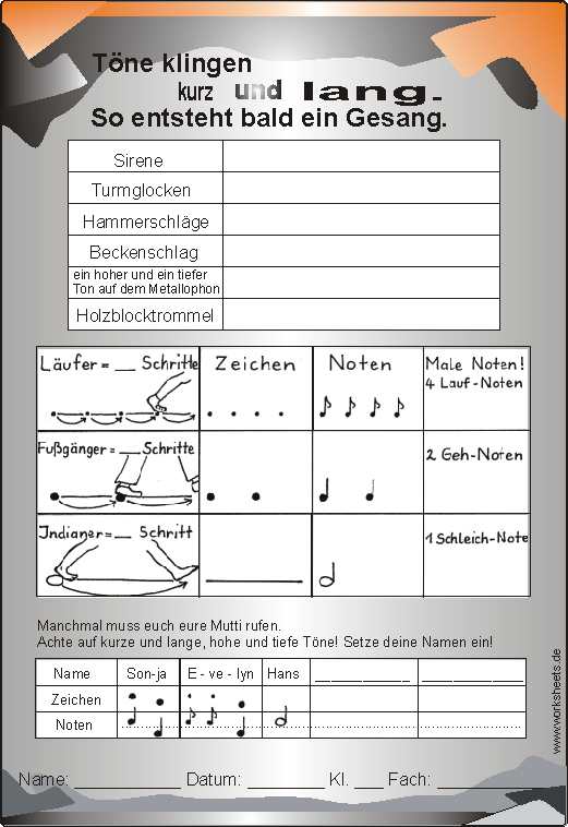 Kurze und lange Töne allgemein und dann speziell: Lauf-Noten, Geh-Noten, Schleich-Noten - Diese Erkenntnisse werden beim Rufen von Namen angewendet, erst in Zeichen, dann in Notenschrift.