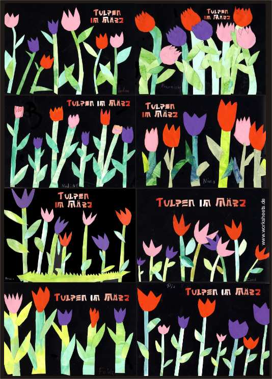Super kreative Ergebnisse einer zweiten Klasse zu den Tulpen im März