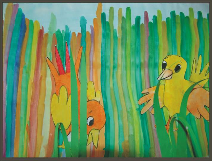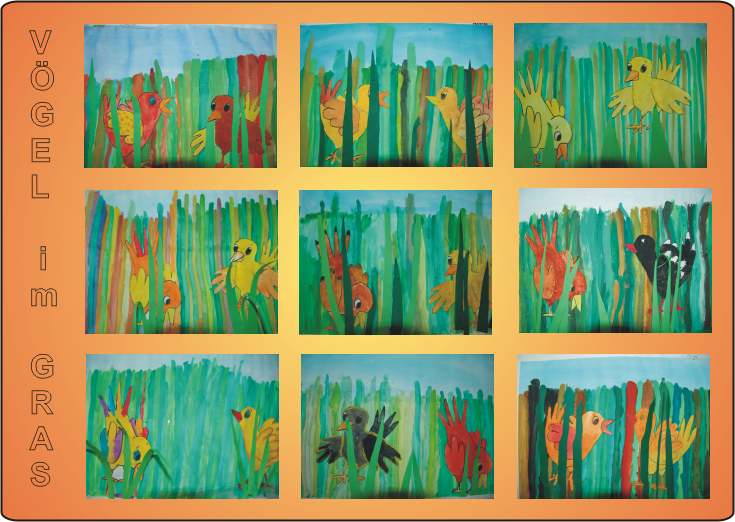 Vögel im Gras - Bildgestaltung mit räumlicher Wirkung (3 D): Im Hintergrund befindet sich etwa zu einem Drittel der Himmel und zu zwei Drittel die Grashalme in den verschiedensten Grünfarben. In den Mittelgrund werden die ausgeschnittenen Vögel gesetzt und dynamisch gruppiert. Aus dem Vordergrund ragen gut verteilt die Grashalme heraus und überdecken zum Teil die beiden Vögel, so dass ein interessanter räumlicher Eindruck entsteht. Der Hintergrund-Himmel wird in “Nass in Nass-Technik” gestaltet. Während das Bild trocknet, schneiden die Schüler die Vogelvorlagen aus und bemalen sie mit Pinsel- und Fingertupfen, damit schöne Federstrukturen entstehen. Mit möglichst vielen Grünfarben werden nun die Grashalme in einem Strich von unten nach oben aufgetragen. In der zweiten Stunde werden die Vögel lebendig gruppiert in das Bild gesetzt und darüber die Grashalme aus grünem Tonpapier geklebt.