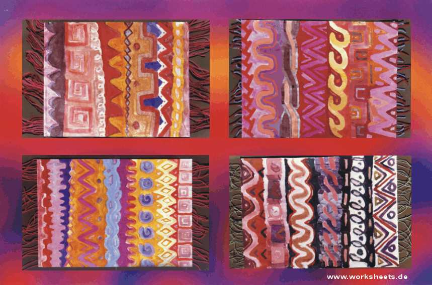 Der Einstieg erfolgte durch eine phatasievolle Geschichte über orientalische Bazars, Teppiche und das Leben der Menschen. Danach bietet sich eine Begriffserklärung “ORNAMENTE” und die praktische Umsetzung in Entwürfe mit Bleistift auf DIN A4 an. Auch die Palette der Rottöne wurde von den Schülern geübt. So entstanden mit Wasserfarben und DIN A3 Zeichenpapier äußerst kreative “Teppiche”, die dann durch farblich passende Fransen aus Wolle eine gut gelungene Komposition abgeben.