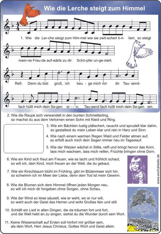 Wie die Lerche steigt zum Himmel, wie sie zwitschert, tiriliert, o steigt meine Freude aufwärts zu dir Schöpfer ungeniert.